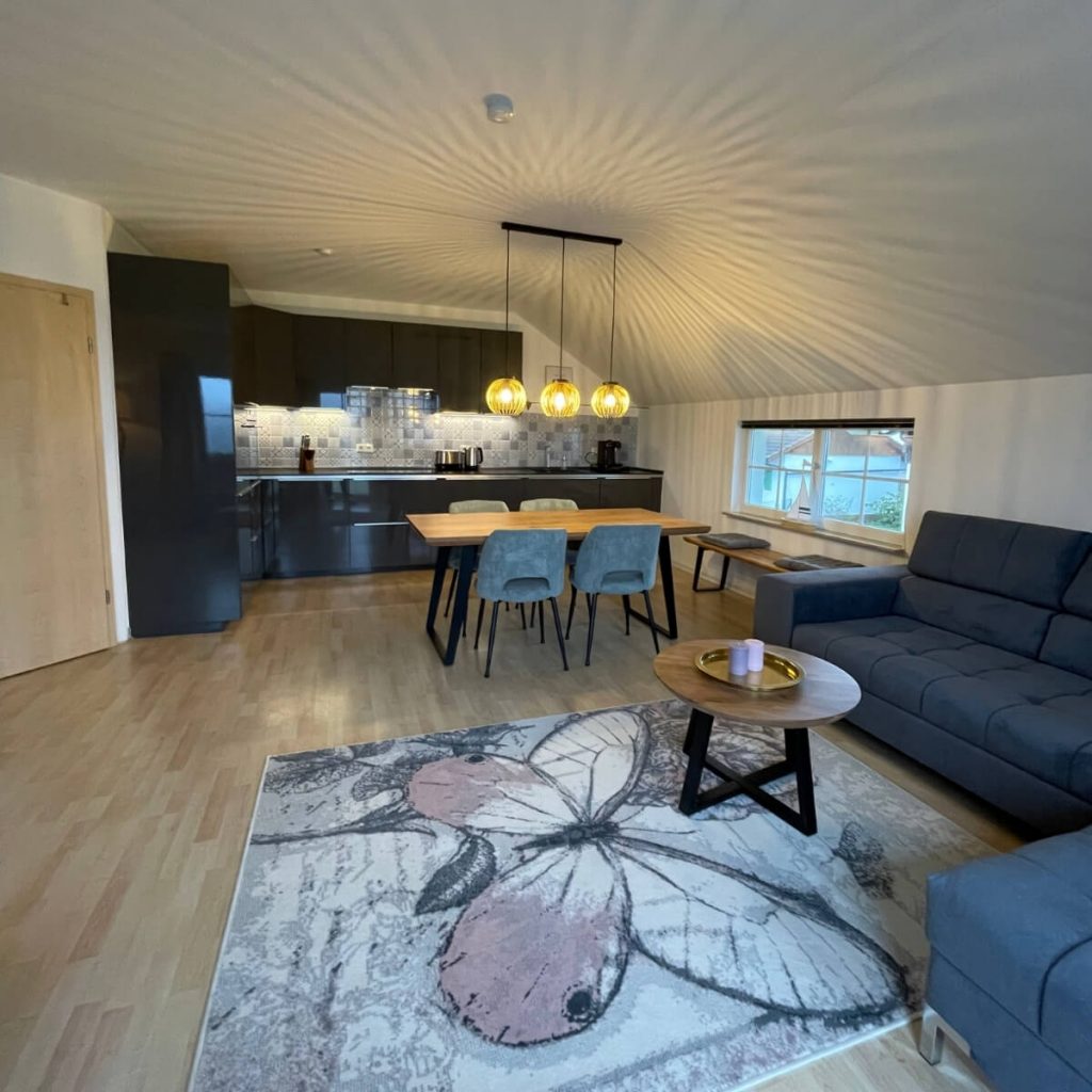 Ferienwohnung Aufhausen Starnberger See mit modernem Sofa und Tageslicht durch Dachfenster